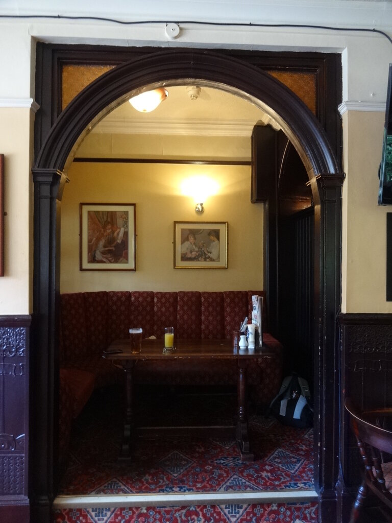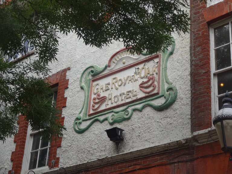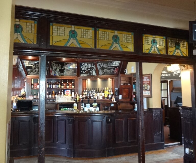 Not only is this pub a grade II listed building, it is also recognised by CAMRA as having a historic interior of local interest. The listing description is as follows: “Hotel and public house. Later 1880s-mid 1890s, minor additions and alterations c1900 and later C20. Corner site with Sycamore Grove. Red brick ground floor and dressings, stock brick returns, rendered upper storeys, applied timber dressings, tile roofs. Asymmetrical plan of two, two and a half and three storeys. Public bar to left with corner entrance. Former hotel to right bay. Canted corner bay, with pair of gabled wings to right, that to far right set forward with deep eaves. Tall gabled left hand return with further entrance under porch. Public bar entrance has segmental canopy with modillion cornice on paired shafts on red brick and rendered base. Pair of part glazed doors with fielded lower panels. Main front ground floor of finely jointed soft red brick framing pairs of windows under wide segmental arches. Public bar windows of etched plate glass under scrolled heads with small paned overlights. Upper canted bay with small paned sashes at first floor, in flush red brick surrounds rising as quoins to upper storey, the window arches in soft red brick. Upper floor paired small paned casements between shafts at the angles. Modillion cornice supports conical roof with flagpole. Gabled bay to right has pair of small paned sashes with slender glazing bars at first floor,behind terracotta balustrade. Central small paned canted oriel possibly added, on bracket beneath gable with applied timber. Right hand gabled wing, set forward, with flush red brick quoins, contains hotel entrance similar to bar but with flat canopy benath three light overlight in eared architrave. Pair of ground floor windows similar proportion to bar, but with triple small paned lights, also with finely jointed soft red brick dressings. First floor oriel, in manner of Norman Shaw, with moulded architraves and small leaded lights some coloured, with curved rendered soffit. Flanked by oculi in red brick architraves,each with tall keystone. Applied timber gable over moulded bressumer supported on carved brackets enriched with flowers. Deep oversailing eaves again with carved brackets enriched with flowers. Left return in three storeys under tall, wide asymmetrical gable with applied timber to forward gablet. Ground floor in stock brick. Pair of wide segmental headed windows similar to those to front bar, with soft red brick dressings. Pair of sashes, the upper sash small paned, in red brick dressings the arches of soft red brick. Pair of first floor sashes with glazing bars with red brick dressings. Moulded plaster cartouche inscribed The Royal Oak Hotel. Second floor triple casement set under gablet, possibly added, and oculus in red brick architrave with tall keystone rising to soffit of gablet. Deep eaves with moulded brackets similar to hotel bay. Brick stacks have moulded collars and wide moulded caps. Rear two storey service wing terminating in similar stack. Gabled porch possibly c 1900, in timber on brick base, with elaborate shafts and dentil conrnice. Ground and first floor sashes with glazing bars. Right return has similar ground floor windows to front elevation, first floor timber casements in large red brick architraves.