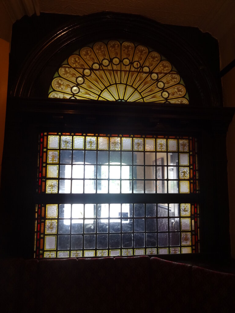 INTERIOR Public bar subdivided by panelled partition with small door. Large horseshoe-shaped bar. Fireplace with cast iron grate to left of lobby entrance. Doorcase with shallow canopy and modillion cornice Screen with coloured glass panels. Lounge has panelled alcove behind round arched architrave, the left side a panel with glazed leaded lights some coloured, beneath fine fanlight with painted flowers to each segment. Panelled dividers between perimeter seating with coloured glass panels. Altered chimneypiece with copper hood. Open well stair with heavy moulded square timber newels, moulded rail and iron balustrade rises to function room. Five bay upper hall with oriel window. Shallow vaulted ceiling with curved, possibly laminated beams, supported on flat kingposts rising from splayed struts, possibly later strengthening. Pair of chimneypieces with timber architraves with shaped heads and beaten copper panels. Iron grates, possibly added, within replaced green glazed tile slips. Gallery at west end, reached by stairs from upper lobby. Splat balustered balustrade boarded over. Panelled doors, those to centre with heavy brass plates, those to side with thin beaten copper plates. Panelled linings and shutter boxes to oriel window. Adjacent room includes corner canted bay, retains doors, door furniture and cornice. Ground and first floor panelled doors with brass plates some with curved handles.”
