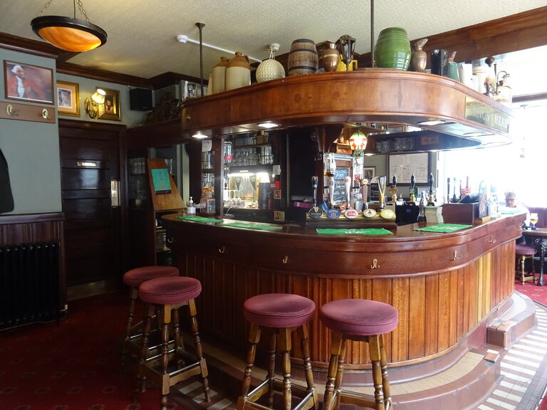 Although this pub is not a listed building, it is a One Star pub on the Campaign for Real Ale’s (CAMRA) National Inventory with an interior of special national historic interest, and the description is as follows: "A small corner local hidden away in the back doubles that was rebuilt in 1939 by Charringtons. The ground floor was originally two small bars – you can clearly see where the partition was with markings on the bar counter and a small section of the tiling around the base missing. The room has 1930’s dado panelling all around, original counters remain with Charringtons checkerboard floor tiling around the base in a step style. There is a change to the counter on the right end – maybe a staff entrance was here originally? It also looks like there was a staff entrance near where the dividing partition was situated with a gap in the tiled step around the base of the counter. The bar back is a good glazed one but there are some glass shelves typical of the 1960s; also a dumb waiter. A door on the left with ‘Lounge Bar’ in gold on a frosted panel leads upstairs to another bar with more 1939 dado panelling, the counter with horizontal panels is not easy to date and the bar back has mirrored panels."