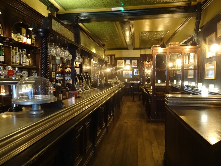 Inside, there is a long servery on the left with a pewter-topped counter, with what looks like an original bar-back stretching along most of the wall behind the servery, with carved wooden pillars and bevelled mirrors. The dumb waiter past the bar-back looks like a modern addition. There's a tiled dado with simple vertical wood panelling beneath it. At the back behind the main room is a small panelled room (the 'Fox's Den') with three tiny intimate snugs at the back of it; but much of the woodwork here is thought to be relatively modern and may date from a 1993 refit."